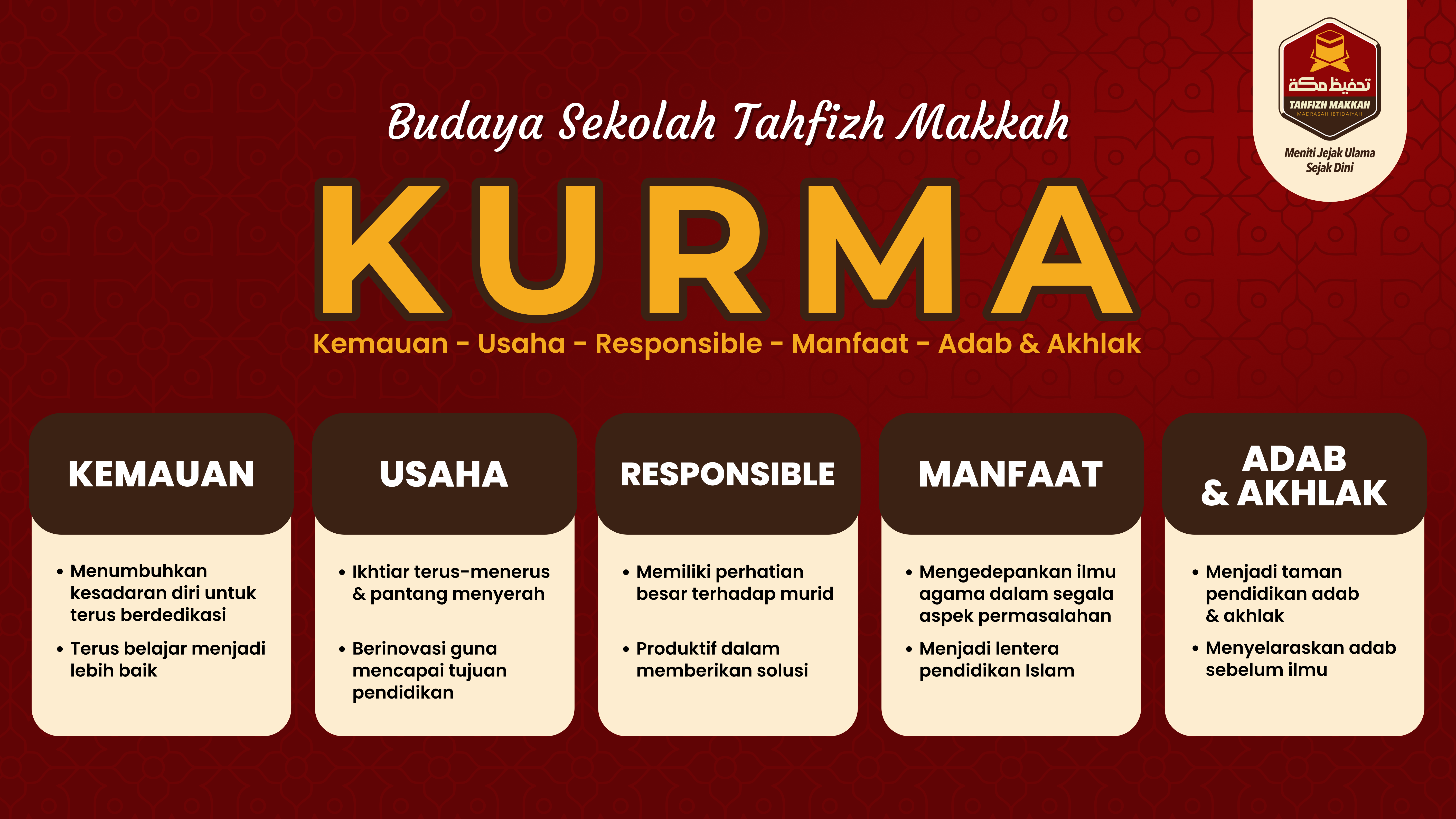 Tahfizh Makkah School aims to build the people by educating children from an early age to become a Rabbani generation through providing them with Alquran and hadith so that they can have the ability to read, memorize and recite them melodiously and can lo